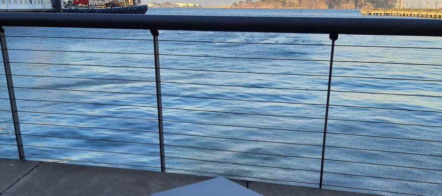 Another pleasing and more modern way anodized aluminum is used in railing systems is by mixing materials. Stainless steel cable tensioned through heave aluminum flat bar up rights creates a strong and visibly unintrusive look. If the view is the feature that needs to be show cased, but safety cannot be ignored this is an elegant solution.
